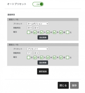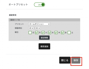 「設定追加」をクリックし、移動させたい場所(プリセット名)、時刻、曜日を選択し設定して「保存」をクリックすれば完了です。